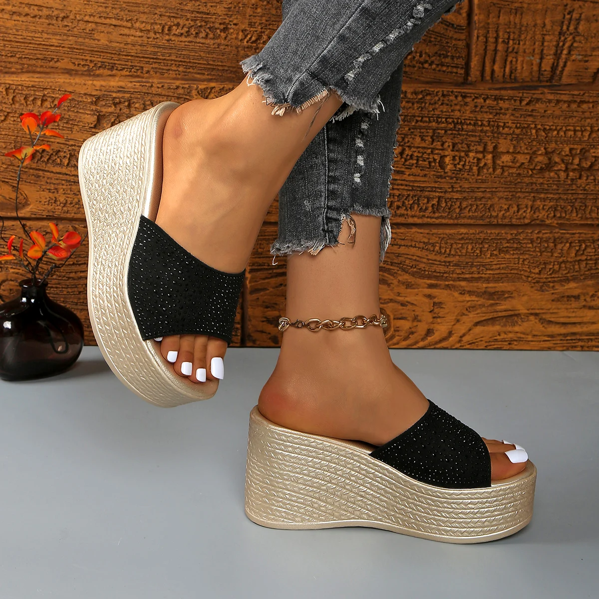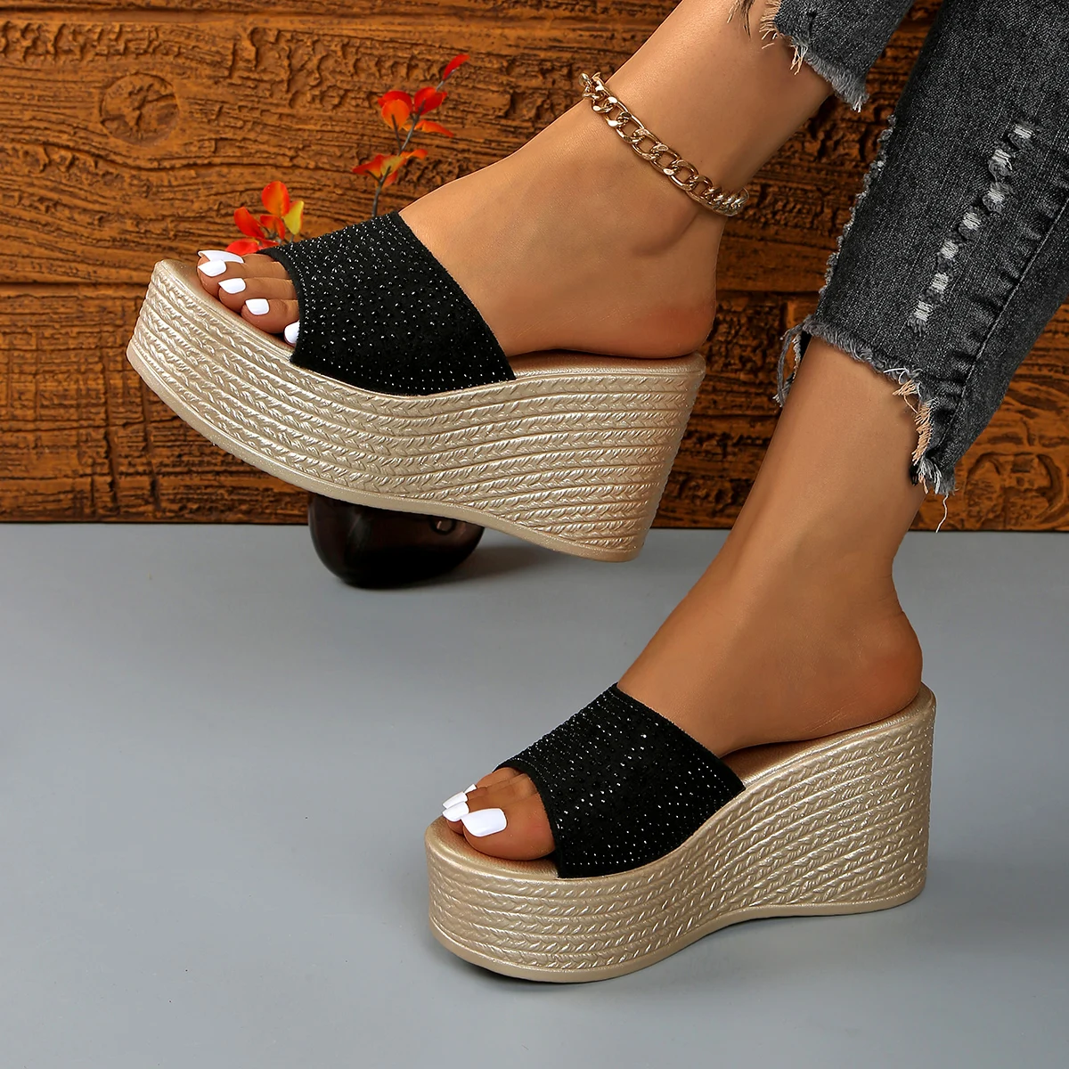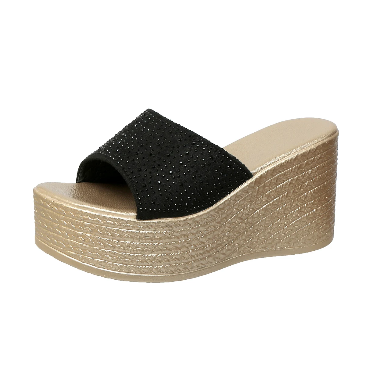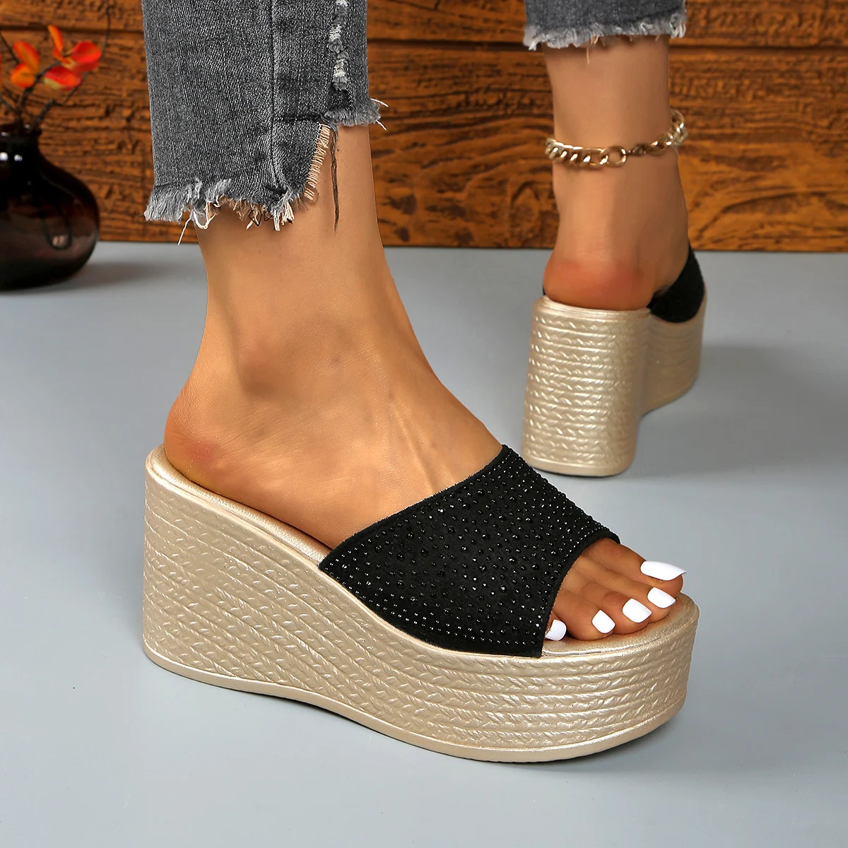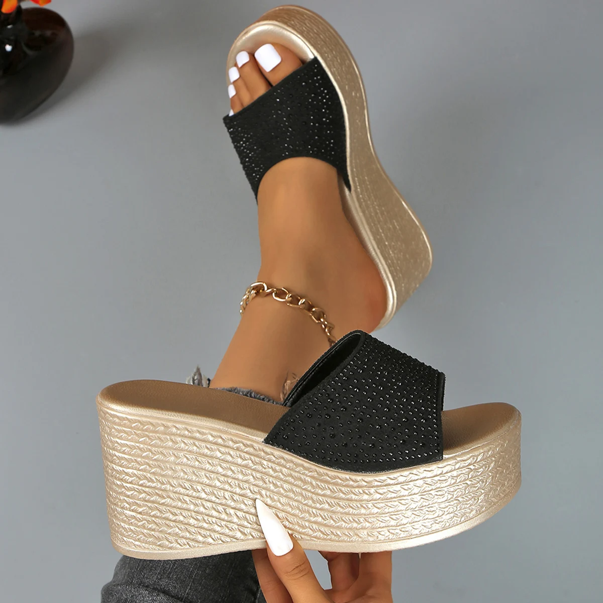 Crystal Decor Thick Bottom Wedge Sandals Women 2025 Summer Chunky Platform Beach